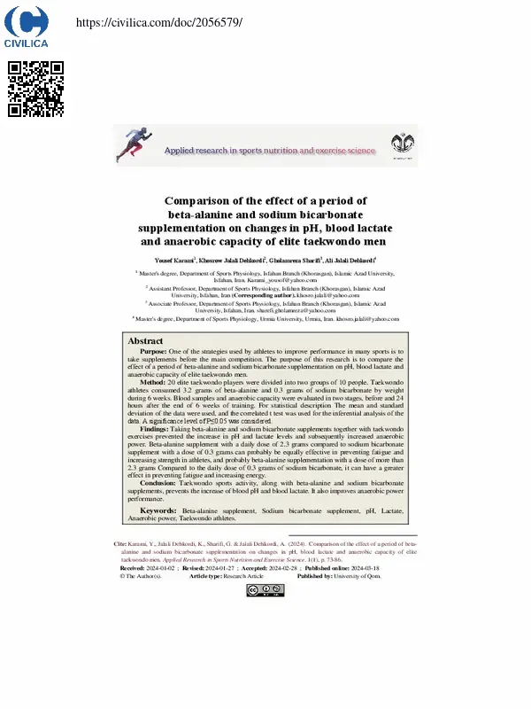 مقایسه اثر یک دوره مصرف مکمل بتاآلانین و بیکربنات سدیم بر تغییرات PH، لاکتات خون و توان بی هوازی مردان نخبه تکواندو