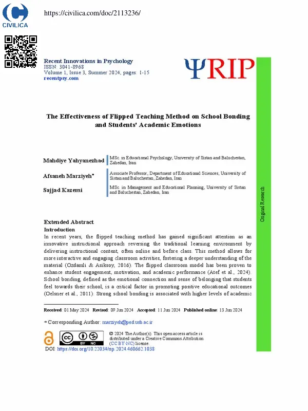 این پژوهش با هدف تعیین اثربخشی روش تدریس معکوس بر پیوند با مدرسه و هیجانات تحصیلی دانش آموزان انجام گرفت. روش انجام تحقیق نیمه آزمایشی از نوع پیش آزمون - پس آزمون با گروه آزمایش و کنترل بود. جامعه آماری این پژوهش شامل کلیه دانش آموزان دختر پایه هفتم شهر میانشهر (فسا) در سال تحصیلی ۱۴۰۳-۱۴۰۲بود که با روش نمونه گیری در دسترس تعداد ۳۰ نفر دانش آموز انتخاب و به صورت تصادفی در دو گروه آزمایش (۱۵ نفر) و کنترل (۱۵ نفر) جایگزین شدند. گروه آزمایش تحت مداخله روش تدریس معکوس طی ۱۲ جلسه ۶۰ دقیقه ای قرار گرفتند، اما گروه کنترل هیچ گونه مداخله ای دریافت نکردند. ابزار پژوهش پرسشنامه پیوند با مدرسه (SBQ) و پرسشنامه هیجان تحصیلی (AEQ) بود. در تجزیه و تحلیل داده ها از تحلیل کواریانس چندمتغیره استفاده شد. یافته های پژوهش نشان داد روش تدریس معکوس بر پیوند با مدرسه اثربخشی مثبت و معناداری دارد (۰.۰۱>P) و توانست میزان پیوند با مدرسه دانش آموزان دختر را افزایش دهد. همچنین نتایج نشان داد روش تدریس معکوس بر هیجانات تحصیلی دانش آموزان اثربخشی بوده (۰.۰۱>P) و توانست هیجانات مثبت را در دانش آموزان دختر افزایش و هیجانات منفی را کاهش دهد. با توجه به نتایج این پژوهش می توان گفت از جمله رویکردهای آموزشی مفید و ارزشمند در جهت تقویت پیوند با مدرسه و هیجانات تحصیلی دانش آموزان، آموزش به شیوه روش تدریس معکوس است.