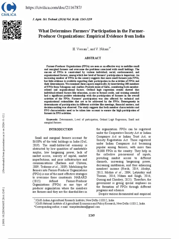 Farmer Producer Organizations (FPOs) are seen as an effective way to mobilize small and marginal farmers and overcome the problems associated with small holdings. The success of FPOs is constrained by various individual, social, environmental, and organizational factors, among which low level of farmers’ participation is important. An increasing number of FPOs in the country suggests that more small farmers join FPOs, but little evidence is available regarding their participation in the activities of FPOs and their determinants. We examined these aspects empirically, by interviewing ۲۰۰ members of FPOs from Telangana and Andhra Pradesh states of India, considering both member-related and organizational factors. Ordinal logit regression results showed that individual-related factors like education, access to formal credit, and training attended had a significant positive relationship with the participation of farmers in the overall activities of the FPOs. Farmers’ participation was also affected by technical and organizational rationalities that are to be addressed by the FPOs. Heterogeneity in determinants of participation in different activities like meetings, financial matters, and decision-making was observed. The study suggests that both member characteristics and FPO characteristics need to be taken into account to ensure the high participation of farmers in FPO activities.