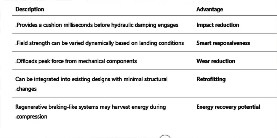 Assuming a landing weight of 10,000 kg with descent velocity of 2.5 m/s, the system must momentarily counter a kinetic energy of ~31.25 kJ. Electromagnetic systems can provide high impulse force, but only for short durations. Hence, it acts as a pre-shock absorber, allowing the hydraulic system to complete the cycle.