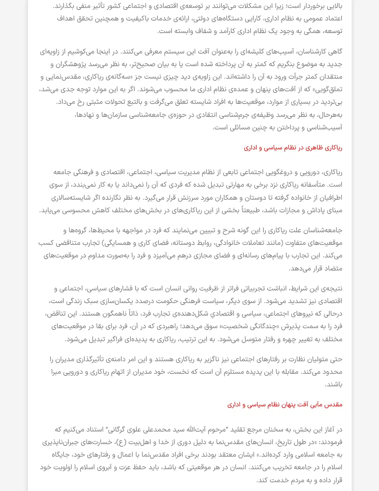 می توان دریافت این آسیب ها با تضعیف اعتماد اجتماعی، گسترش فساد اداری، ایجاد موانع در مسیر اصلاحات و حذف نظام شایسته سالاری، جامعه را به سمت عقب ماندگی و بحران مشروعیت سوق می دهند. مقابله با این معضلات، مستلزم اصلاح ساختارها، تقویت اخلاق حرفه ای، افزایش شفافیت و ارتقای سطح پاسخگویی مسئولان است. سه گانه ریاکاری، مقدس مابی و تملق گویی به عنوان آفات نظام سیاسی و اداری، از منظر آسیب شناسی و جرم شناسی انتقادی، ریشه در ضعف های ساختاری و فرهنگی دارد و مقابله با آن نیازمند اصلاحات بنیادین در نظام های اداری و فرهنگی است.