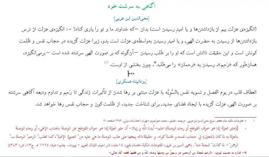 - [(مثیر العزله انما هو خوف القواطع او رجاء الوصله) اعلم- ایدنا الله و ایاک- ان مثیر العزله انما هو خوف القواطع عن الوصله بالجناب الالهی، او رجاء الوصله بالعزله به لما کان (المعتزل) فی حجاب نفسه و ظلمه کونه. و حقیقه ذاته یبعثها علی طلب الوصله ما هی علیه من" الصوره الالهیه"، کما تطلب" الرحم" الوصله ب" الرحمن"- لما کانت" شجنه منه". (محیی الدین بن عربی، الفتوحات المکیه ،عثمان یحیی، 14جلد، دار احیاء التراث العربی - بیروت، چاپ: دوم، 1994 م. ج13، ص: 383)]