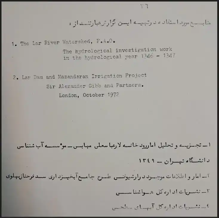 بخشی از نامه مشاور به وزیر کشاورزی در مورد امکان سنجی سد لار، 1945