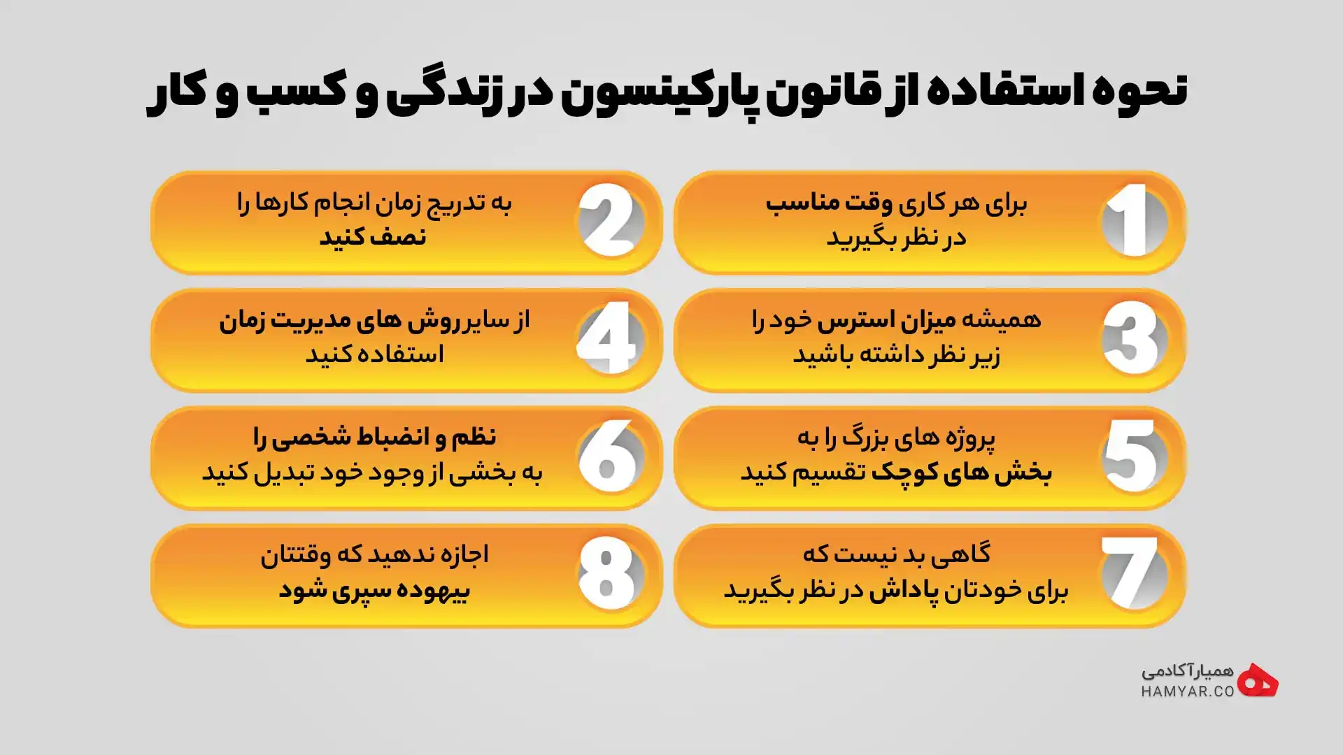 قانون پارکینسون بیان می کند: «کار به گونه ای گسترش می یابد که زمان موجود برای تکمیل آن را پر کند.»